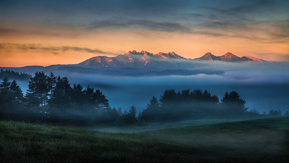 In this classic dawn scene, the cool night air has allowed mist to form in the low lying land areas whilst the sun rises with orange hues in the background, creating a contrast with the green grass in the foreground. The story is about the awakening of a new day: a promise of beautiful weather. The lines of the clouds, echoed by the lines of the mountains, mist trails and foreground landscape are consistent with the relatively wide landscape crop which emphasises the sense of space.