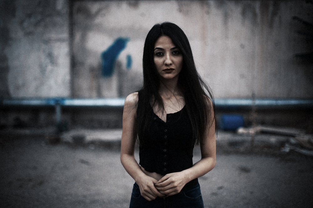 Continuing with the theme of contextual surroundings, this girl is in a stark urban setting and the hard unfriendly stare combined with her simple black top and jeans indicate a relatively poor and unwelcoming neighbourhood. Again the photographer is part of this image. He or she has been accepted for the moment in order to take the picture but one gets the sense that they will move on quickly. A grainy texture and high contrast add to the mood.