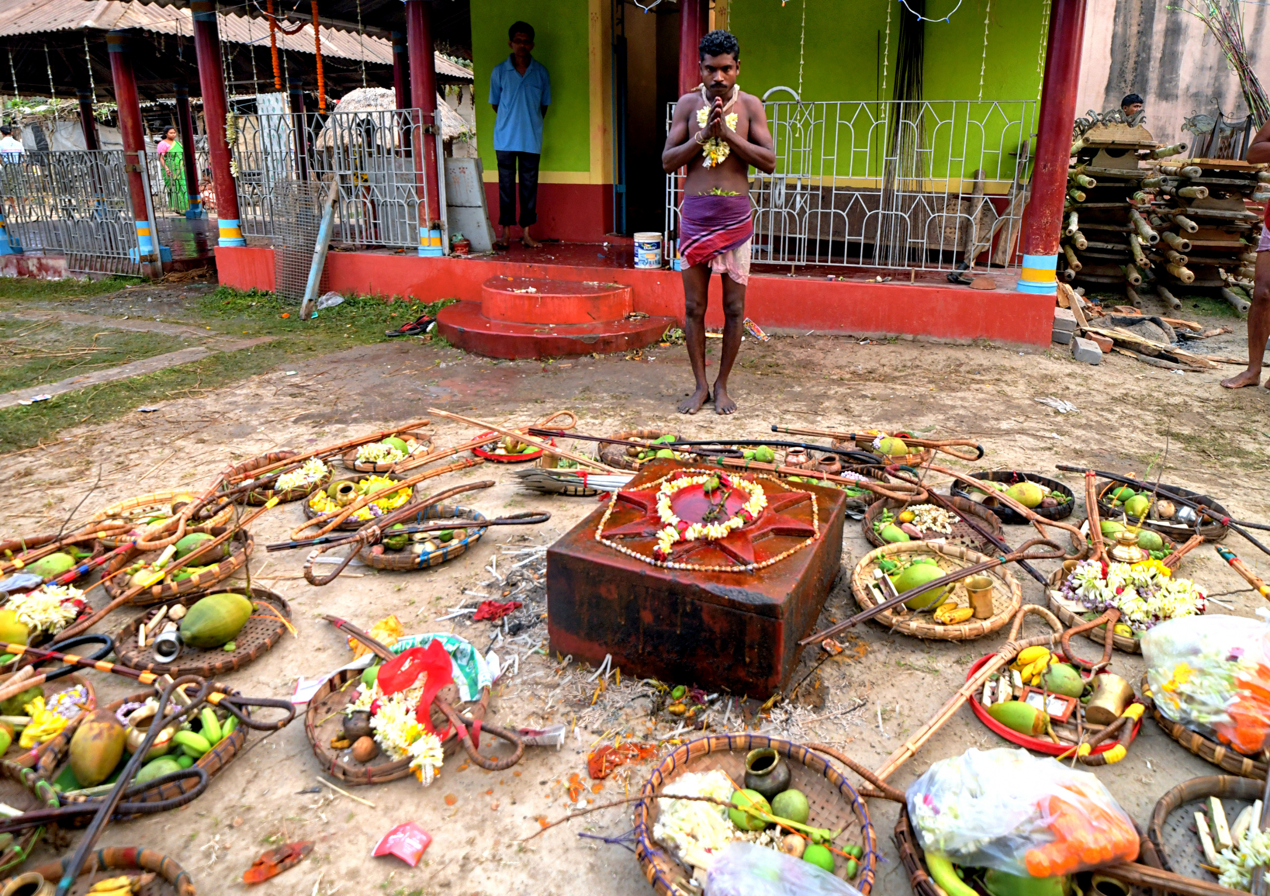 All Sannasir are in bare bodies, wearing only small langot, as Indian village wrestlers wear during wrestling. After reaching their original destination, the devotees slowly start removing the iron rods from their mouth and body. This time faint traces of blood are noticed in their mouth and body. Surprisingly, they don’t use any antiseptic or any medicine on their injuries. Immediately after removal of the iron rods, they are provided with some leaves which they put into their mouth. The leaves are locally known as ‘Kala Puspa’. It is used to stop bleeding and reducing pain and it works like magic. It is known that injuries are cured within two three days. The morning ritual is finished after they removed the iron rods.