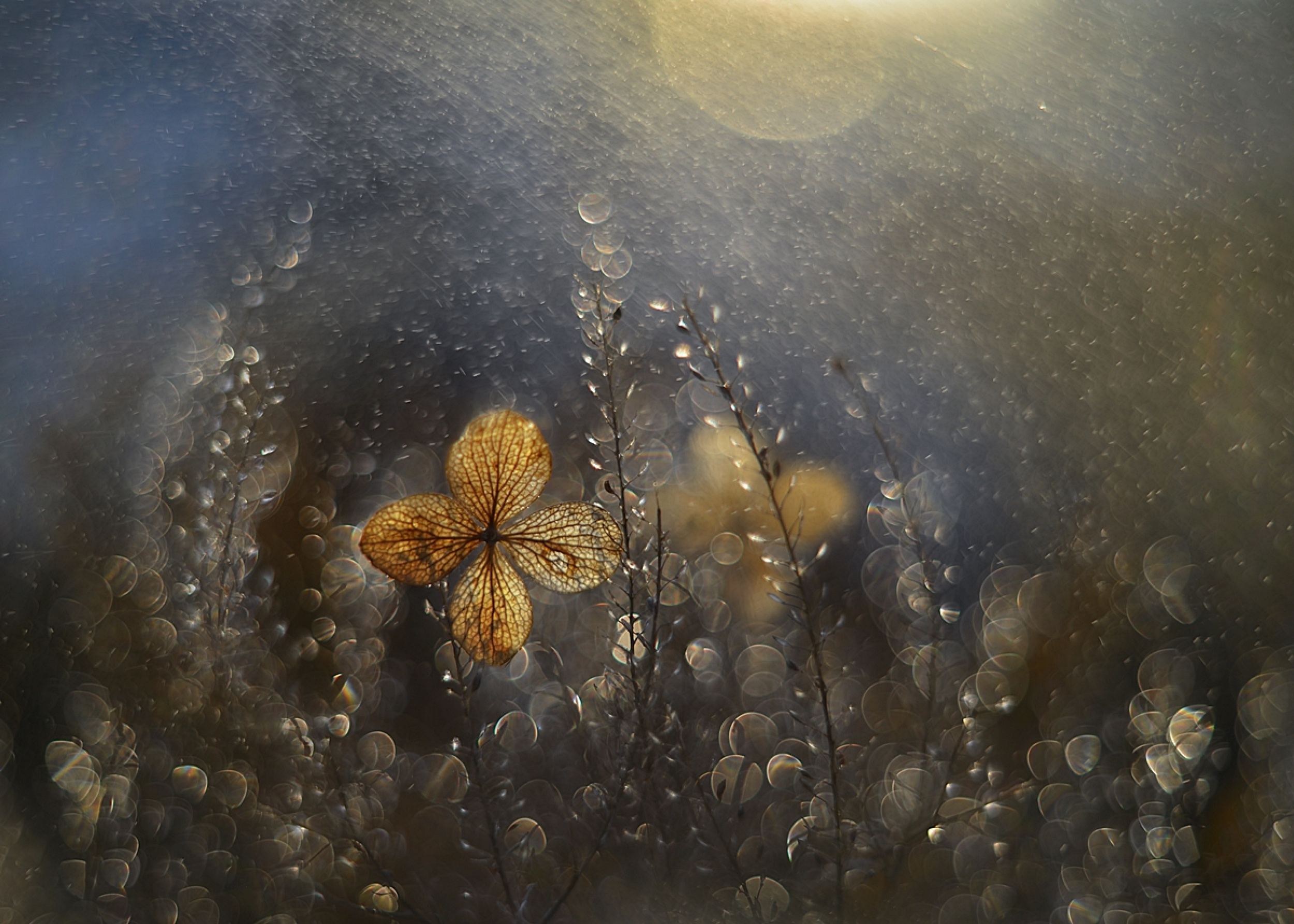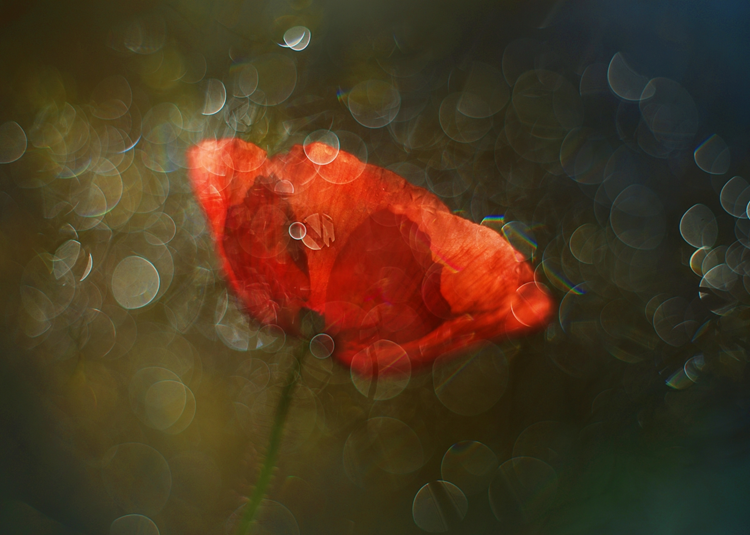 On the poppy flower, rays of sunlight are falling on it but in the upper part, the sun was low behind the poppy.  I placed a glass sprinkled with water. This gave me a decorative background in circles. For this picture, I used a double exposure: the first shot of the flower, and the second from the background with a dewy glass. I set the exposure time to 1/1600s and the aperture to f1.8.