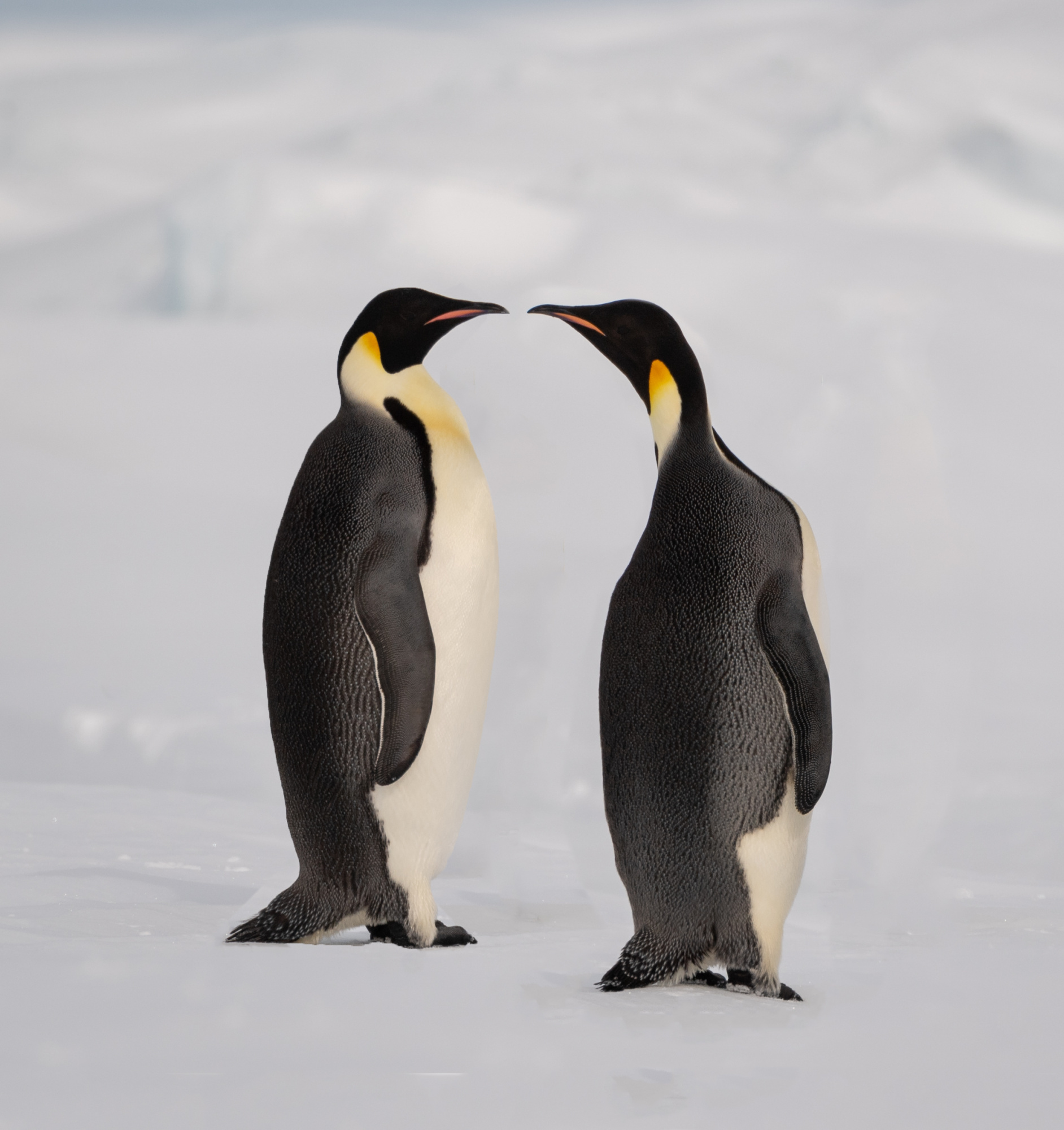 Snow Hill Island is home to up to 10,000 Emperor Penguins, making it the northernmost location on the continent where these penguins can be found. Wild Emperor penguins are only found in Antarctica. They breed and raise their young mostly on ‘fast ice’, a floating platform of frozen ocean which is connected to the land or to ice shelves. From birth, they spend their entire lives in and around the Antarctic ice, although very rarely vagrants have turned up off the coast of New Zealand. Emperors are the biggest of the 18 species of penguin found today, and one of the largest of all birds. They are approximately 120cm tall (about the height of a six year old child) and weigh in at around 40 kg, though their weight does fluctuate dramatically throughout the year. Emperors are the least common Antarctic penguin, with global population estimates of 265,500–278,500 breeding pairs. Emperor penguin colonies have been discovered and counted from space. For the last 15 years, British Antarctic Survey (BAS) scientists have been looking for new colonies by searching satellite imagery for their guano stains on the ice. There are now 66 known emperor penguin colonies around the coastline of Antarctica. Emperors incubate their eggs during the long dark southern winter months. Courtship displays are intricate but copulation is quick and the female lays a single egg in May or June. She then passes it over to her mate to incubate - and she’s off. She spends the next nine weeks at sea, feeding. The male carefully balances the egg on his feet for between 65 – 75 days to keep it warm in a specially adapted brood pouch, and off the snow surface, before it hatches. Emperors are uniquely adapted to survive these harsh conditions when temperatures can drop down to a bone chilling -50°C and with winds of up to 200km/hr. They have two layers of feathers, a good reserve of fat and proportionally smaller beaks and flippers than other penguins to prevent heat loss. Emperors also have feathers on their legs, so their ankles don’t get too chilly. Even their feet are adapted to the icy conditions, containing special fats that prevent them from freezing and strong claws for gripping the ice. But most remarkably, colonies of adults and chicks work together to huddle for warmth. 5,000 or more tightly packed adults and chicks shuffle around, so each takes a turn - but not too long - on the outside of the huddle where it’s cold. This is in complete contrast to their quarrelsome and territorial neighbours, the Adélie penguins. Their strong sense of community literally keeps them alive. Their impressive size and colour makes them extremely popular and a favourite subject for wildlife photography.